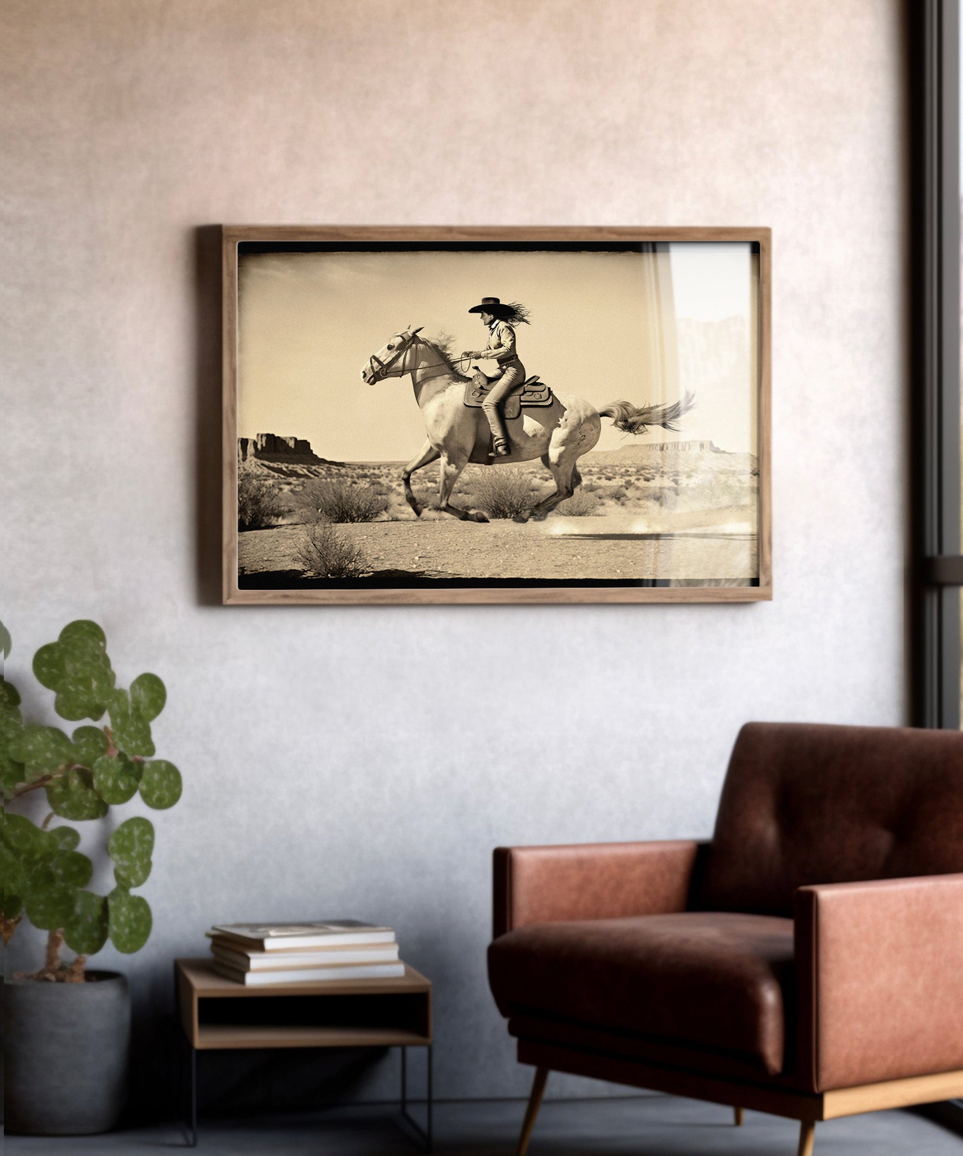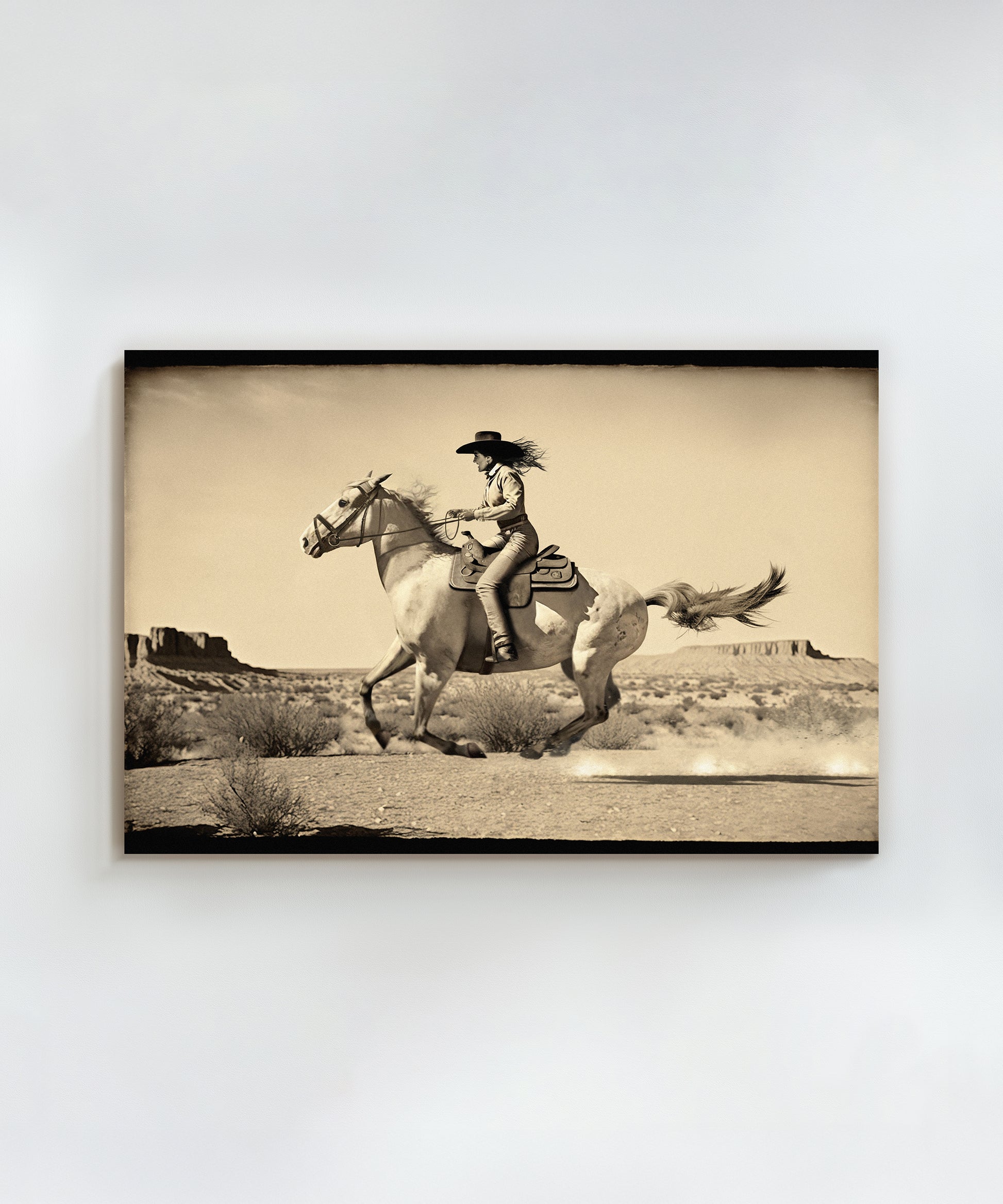 This action-packed print of a Wild West cowgirl riding a horse is inspired by vintage film frames of Western movies. It imagines what it would look like to take one of those frames and blow it up full scale.