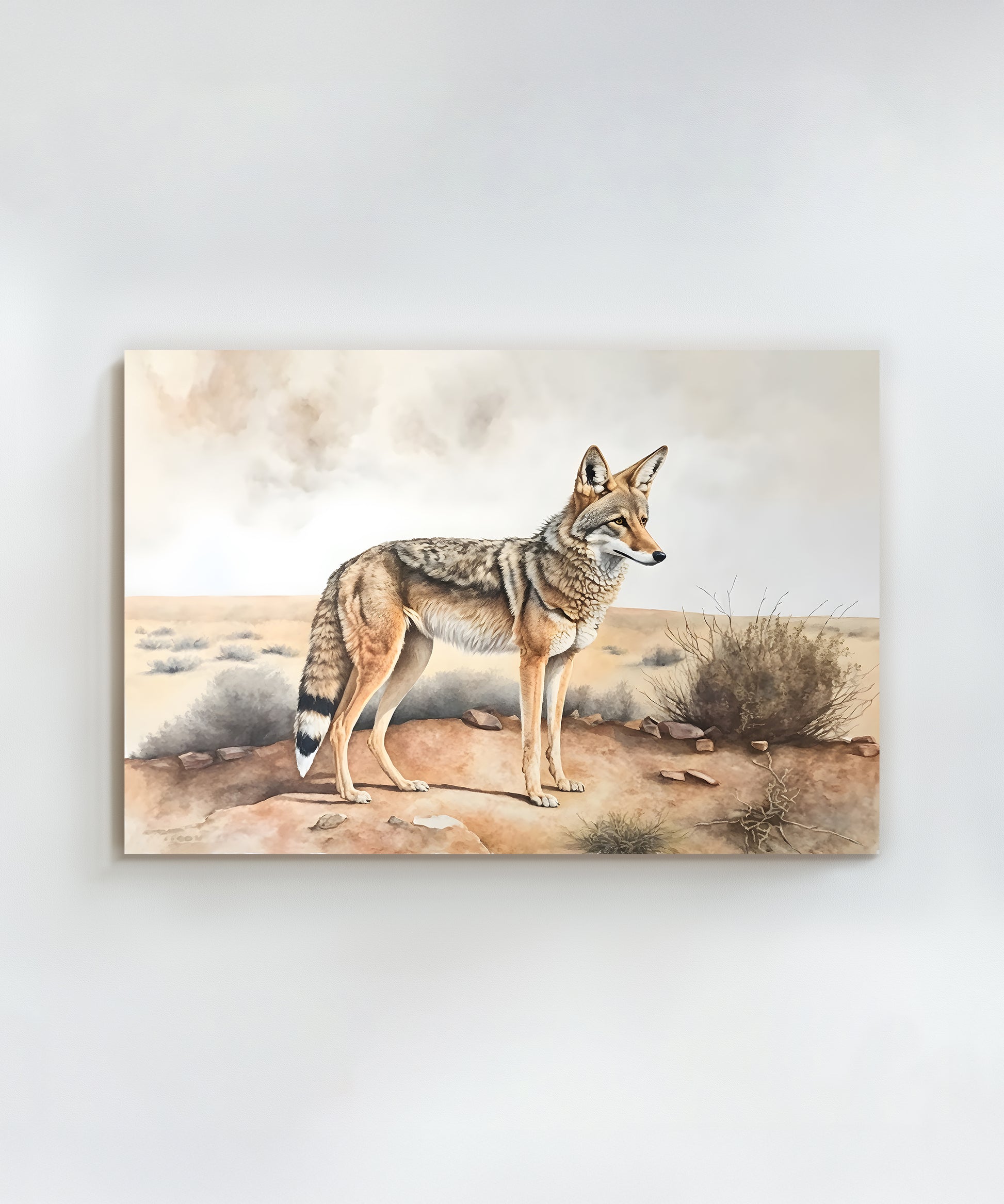 This minimalistic print of a coyote in the desert is inspired by the classic watercolors you'd see in hotels, postcards, and textbooks as a kid. Simple yet striking, this piece will be the perfect addition to any ranch or cabin home.Â