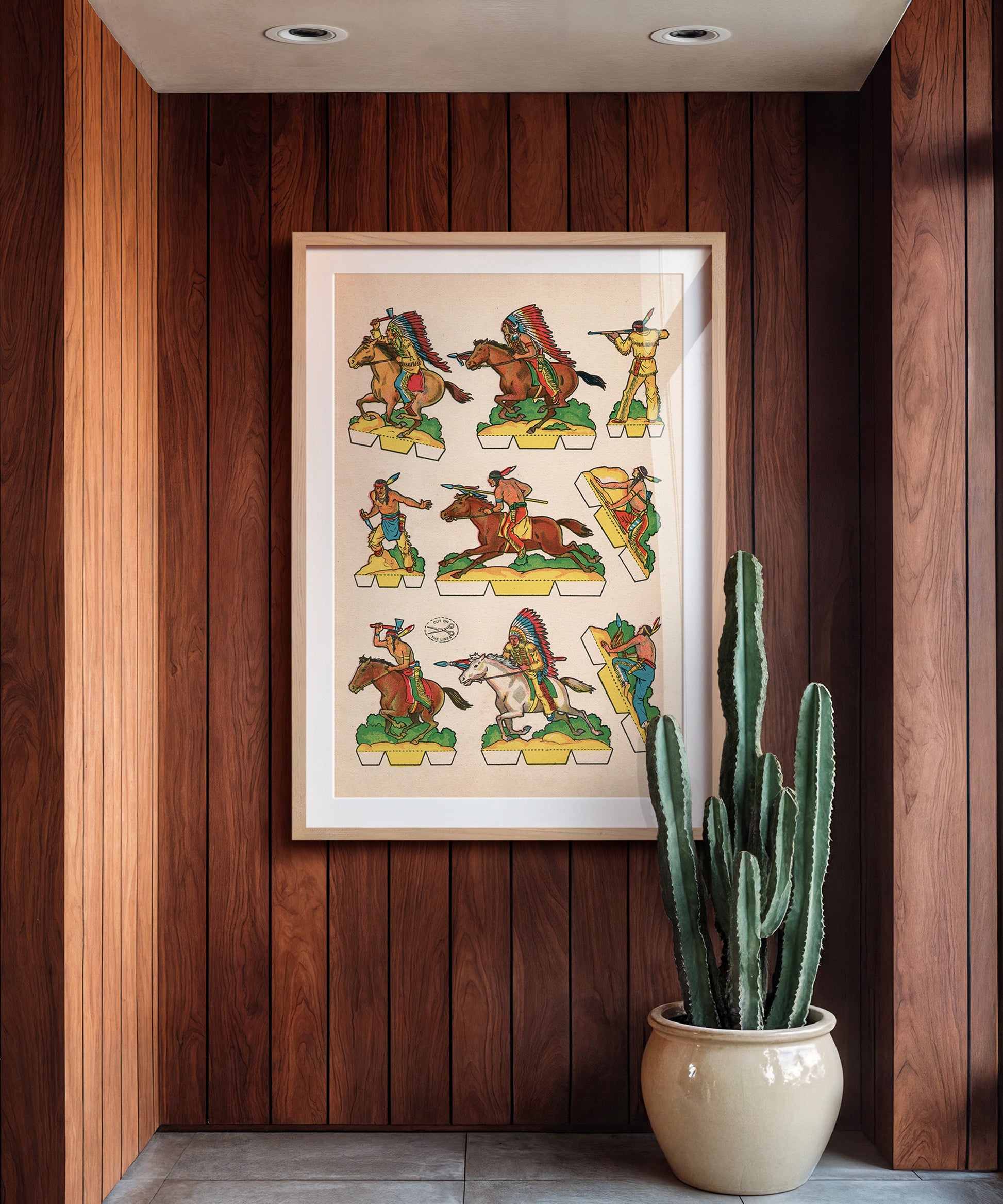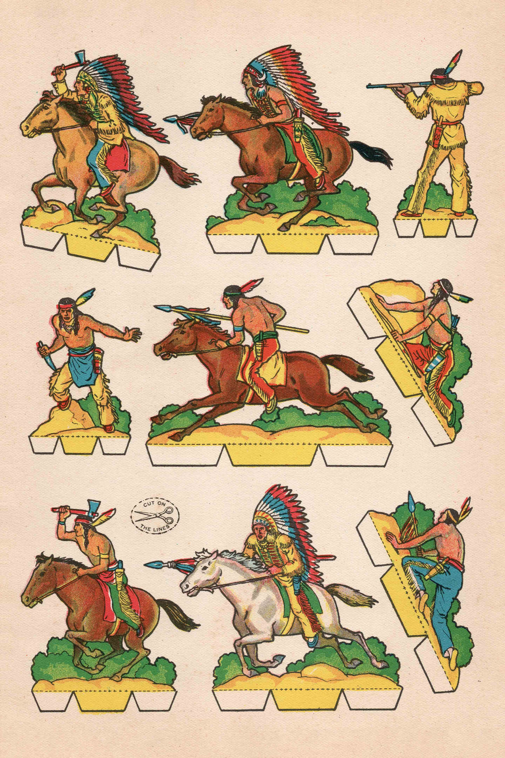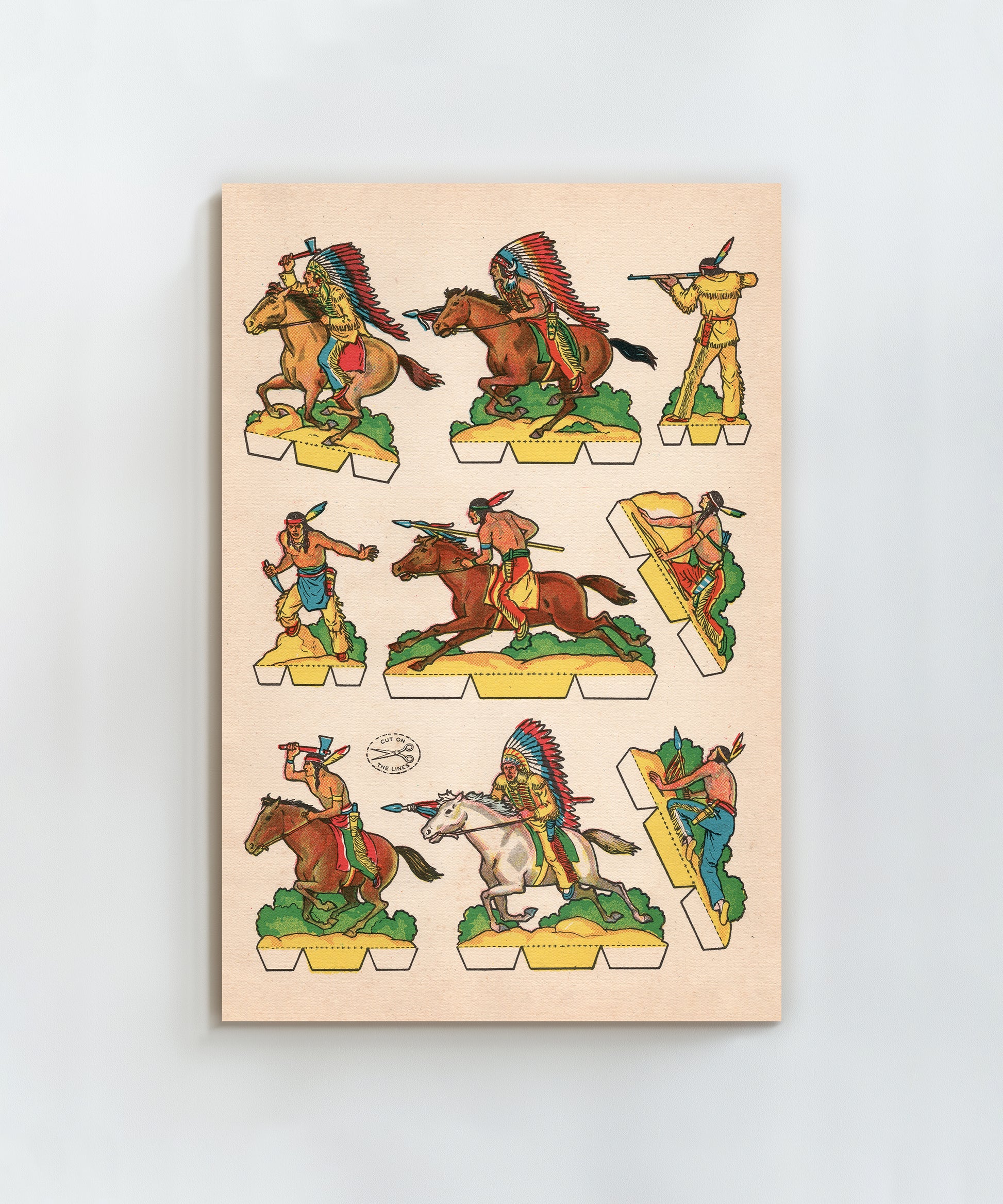 This piece is page #2 from Luchas del Oeste, a vintage Spanish publication from the 1950s which translates to Warriors of the West. These cutout-style publications, known in Spain as recortables, were popular with kids in the early and mid-1900s as an easy way to create your own action figures. All they had to do was cut along the lines, as marked by the scissor icon in the piece. With vivid colors and a vintage printing technique on full display, these cutout warriors are a piece of history that will bring bold modern style to your space.