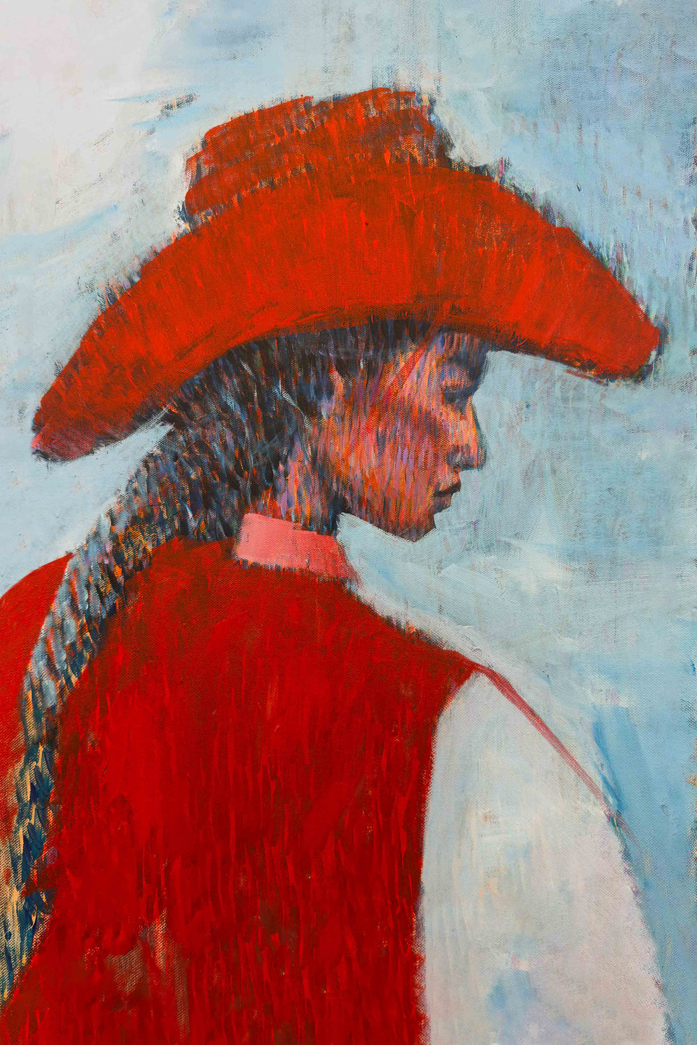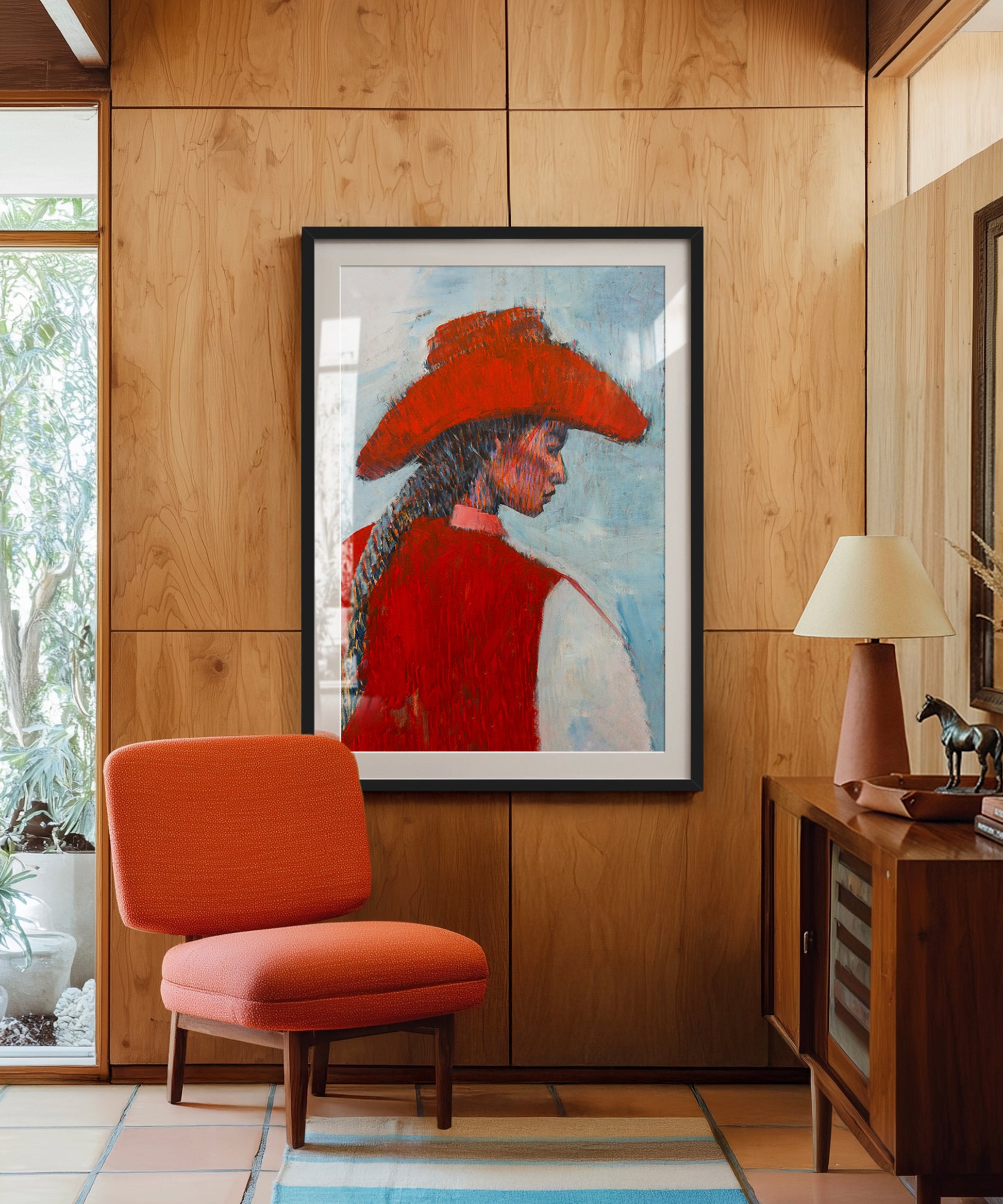 This eye-catching cowgirl, with her red vest and red cowboy hat, is print #19 in Jess Tedder's series showcasing the different characters of the wild west. Originally created in brilliant oil pastels, this slightly abstract piece is sure to pop on your walls. Hang it in a large format size for dramatic effect, or pair it with one of Tedder's other wild west characters to create a stunning gallery wall.