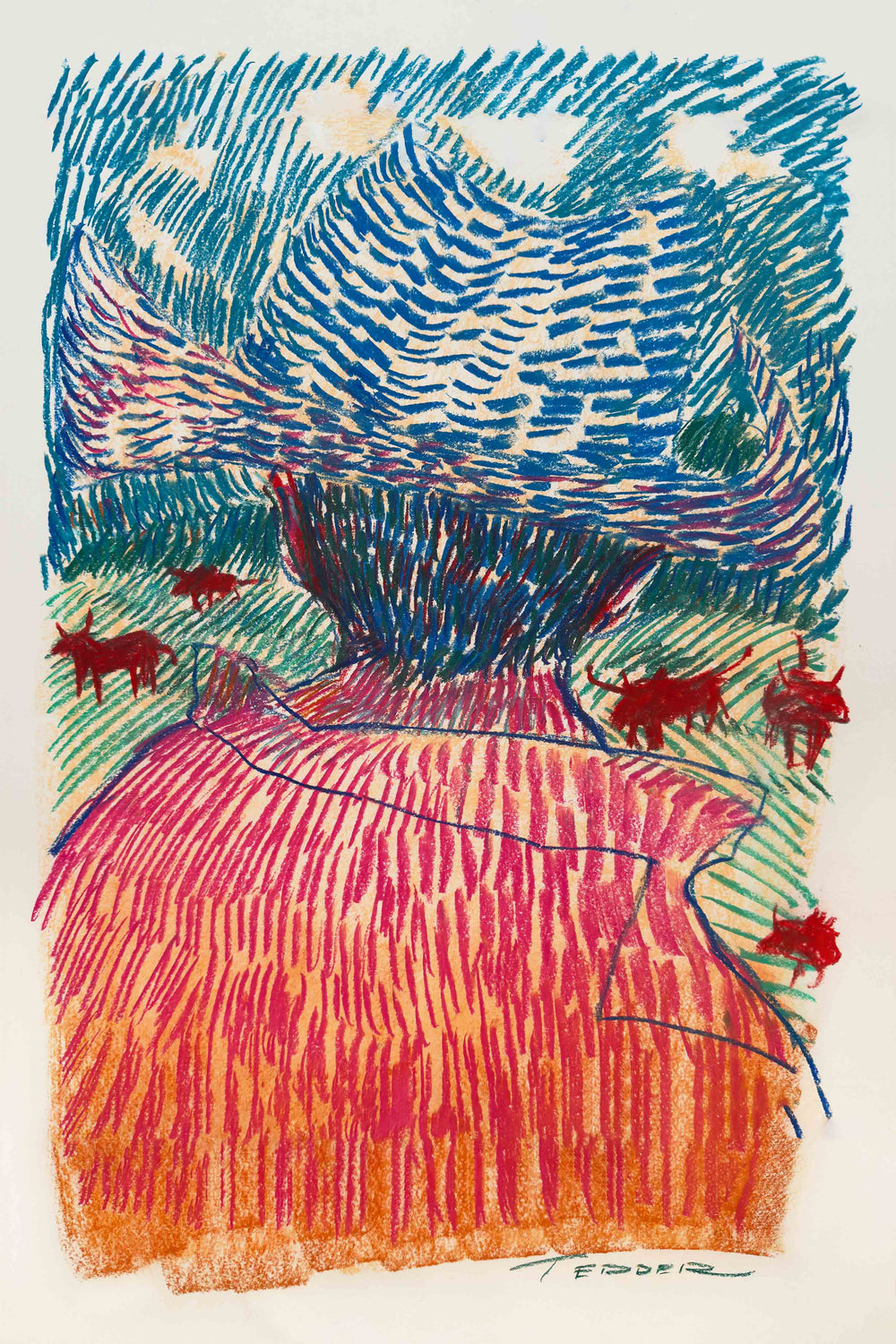 In this abstract piece, Jess Tedder once again captures a cowboy portrait in a highly original and captivating fashion. #21 in her Wild West Characters Series, this colorful piece was originally created in loose and creative strokes of oil pastels. Seemingly simple, yet visually stunning, this print will be a conversation piece from the moment it goes up on your walls.