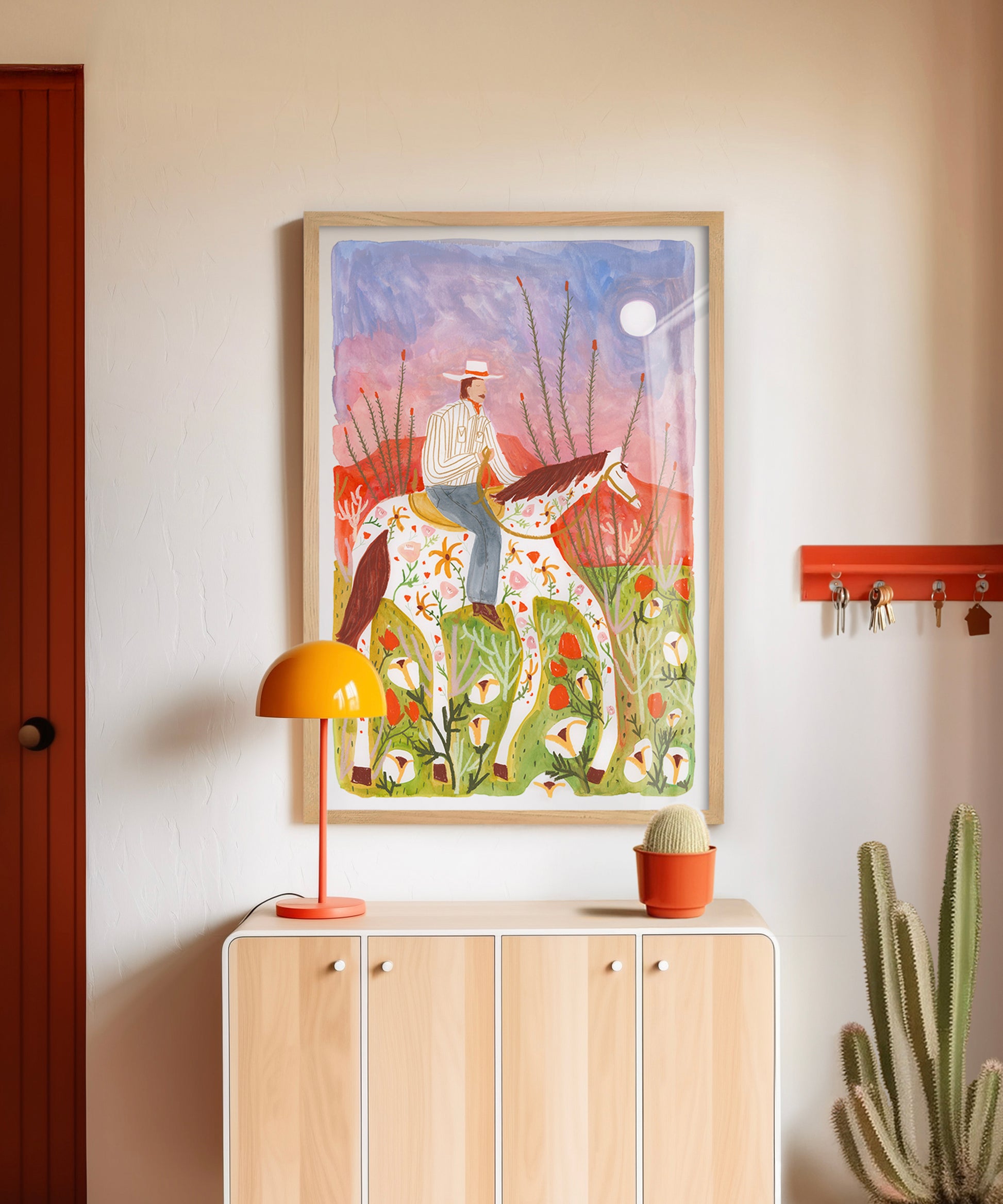 Melissa Lakey’s Wildflower Trail Ride captures a joyful cowboy journeying through a desert landscape on his flower adorned horse. Created in Lakey’s signature playful style, this piece radiates warmth and whimsy, making it an ideal addition to any western-inspired space. Whether adorning a nursery, living room, or hallway, its lively colors and cheerful composition are sure to brighten the atmosphere.