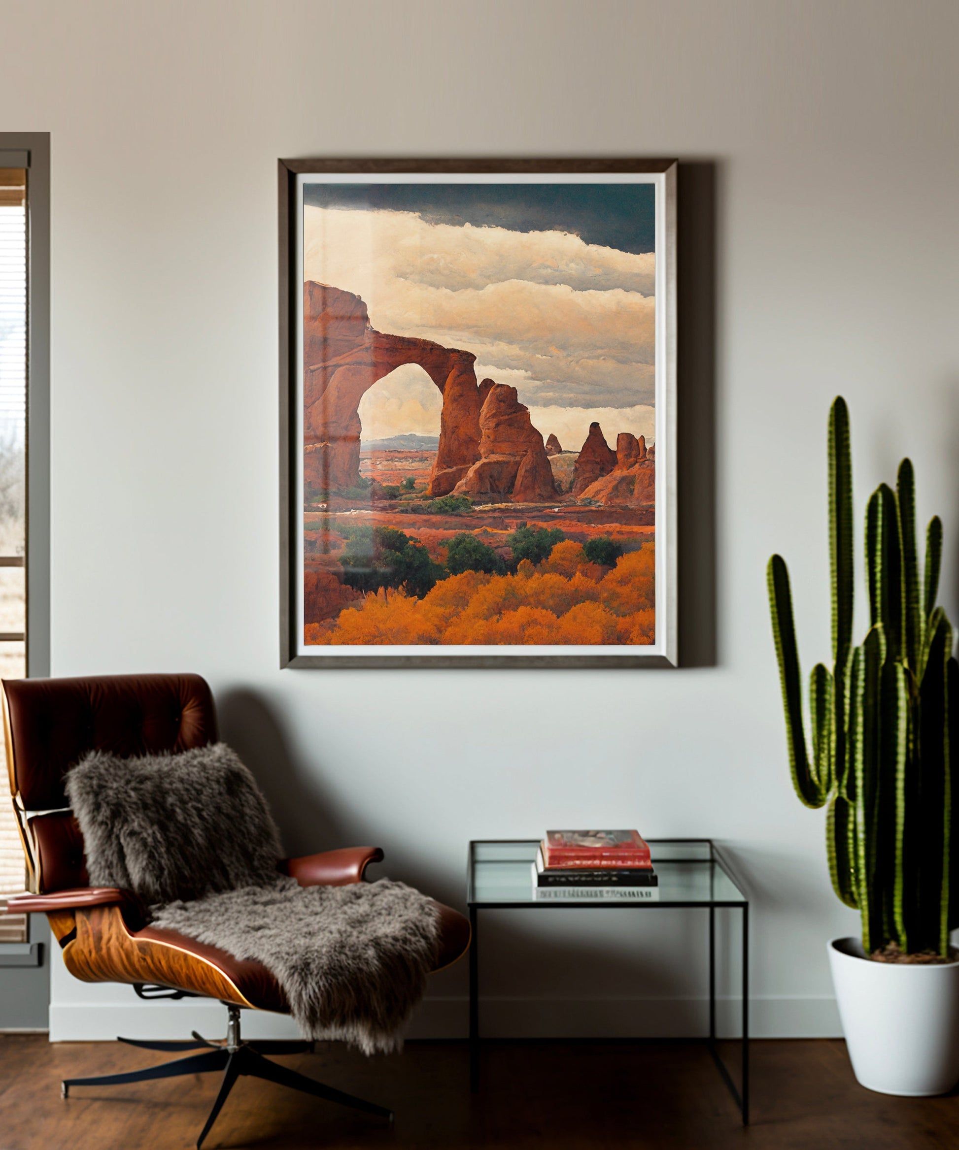 This modern landscape print of the Utah desert is the perfect wall art for any western or southwestern home, cabin, ranch or lodge. Inspired by the beautiful formations of Arches National Park, this abstract oil painting makes the perfect decor gift for the traveler/camper in your family. Also goes great in any boho or eclectic space!