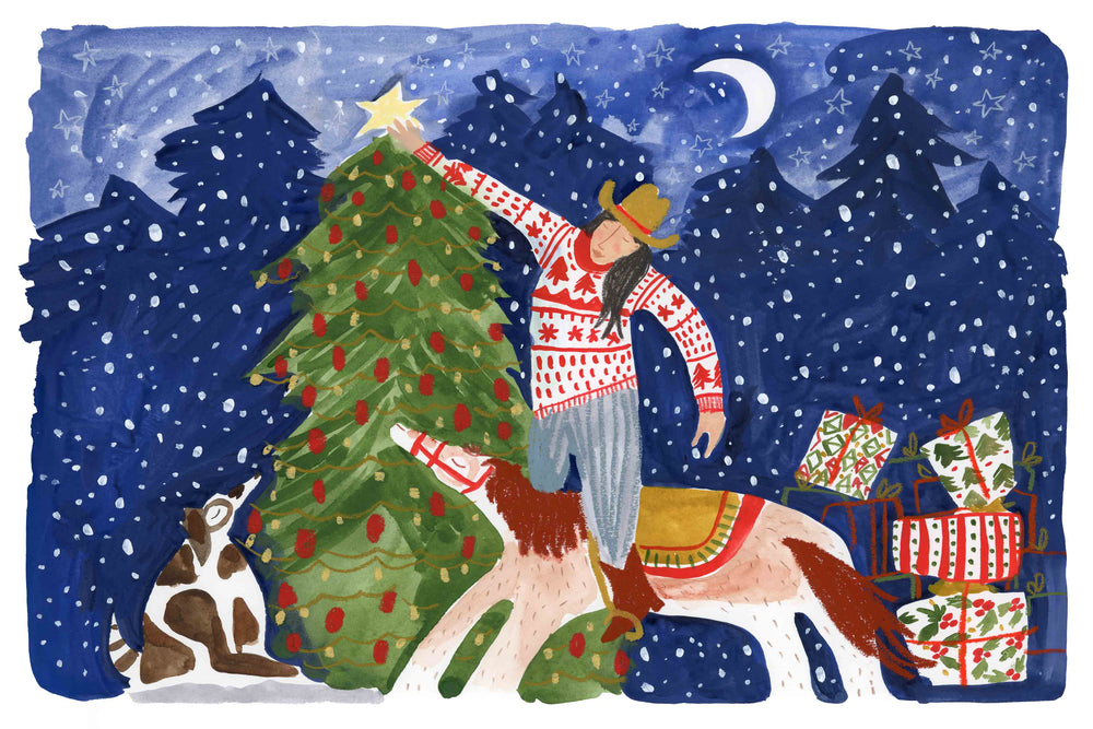With a little help from her trusty partners, a cowgirl stretches to put the finishing touches on her Christmas tree in this charming holiday print by Melissa Lakey. Filled with Melissa’s signature whimsy and warmth, this piece makes the perfect addition beside your tree this season. For double the Christmas charm, pair it with her matching cowboy print, "Adding the Star."