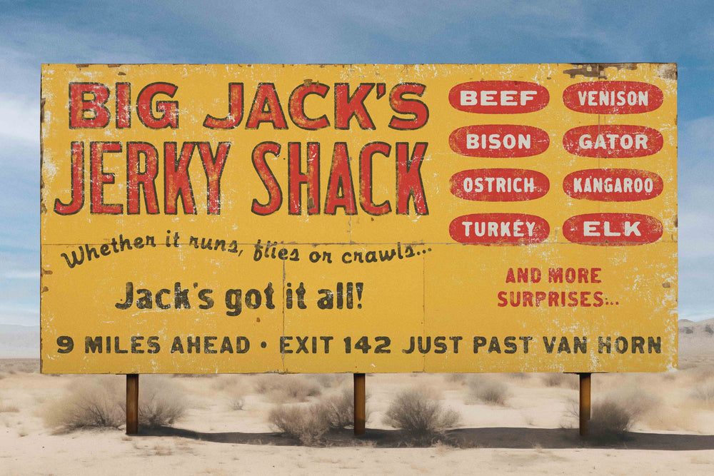 This piece is print #1 in our Road Trip Attractions Series - a collection inspired by the interesting and quirky establishments you'll see billboards for on a road trip out west. This print is the billboard for Big Jack's Jerky Shack, an establishment that has every flavor of jerky imaginable. Whether it runs, flies, or crawls, Jack's got it all!