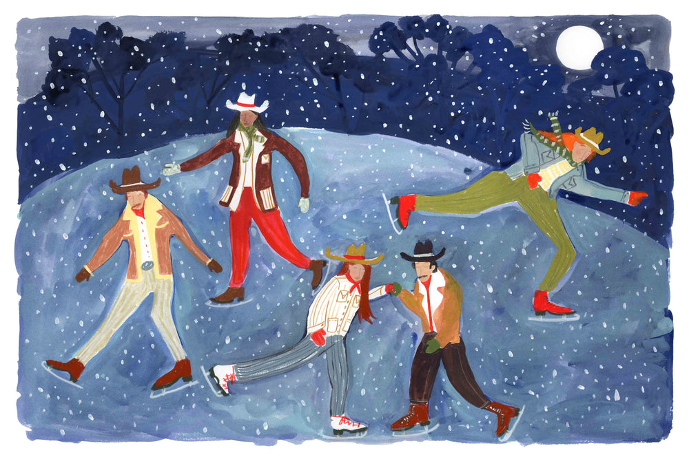 The ice doesn't often freeze in the heat of the West, but when it does you have to take full advantage! In this holiday filled print by Melissa Lakey, that's exactly what a group of cowboys and cowgirls are doing, as the strap on their skates and hit the fresh ice. A playful reminder to take a little break from the work and have some fun this holiday season, "Moonlight Skaters" will add the charm to your walls this winter.Â