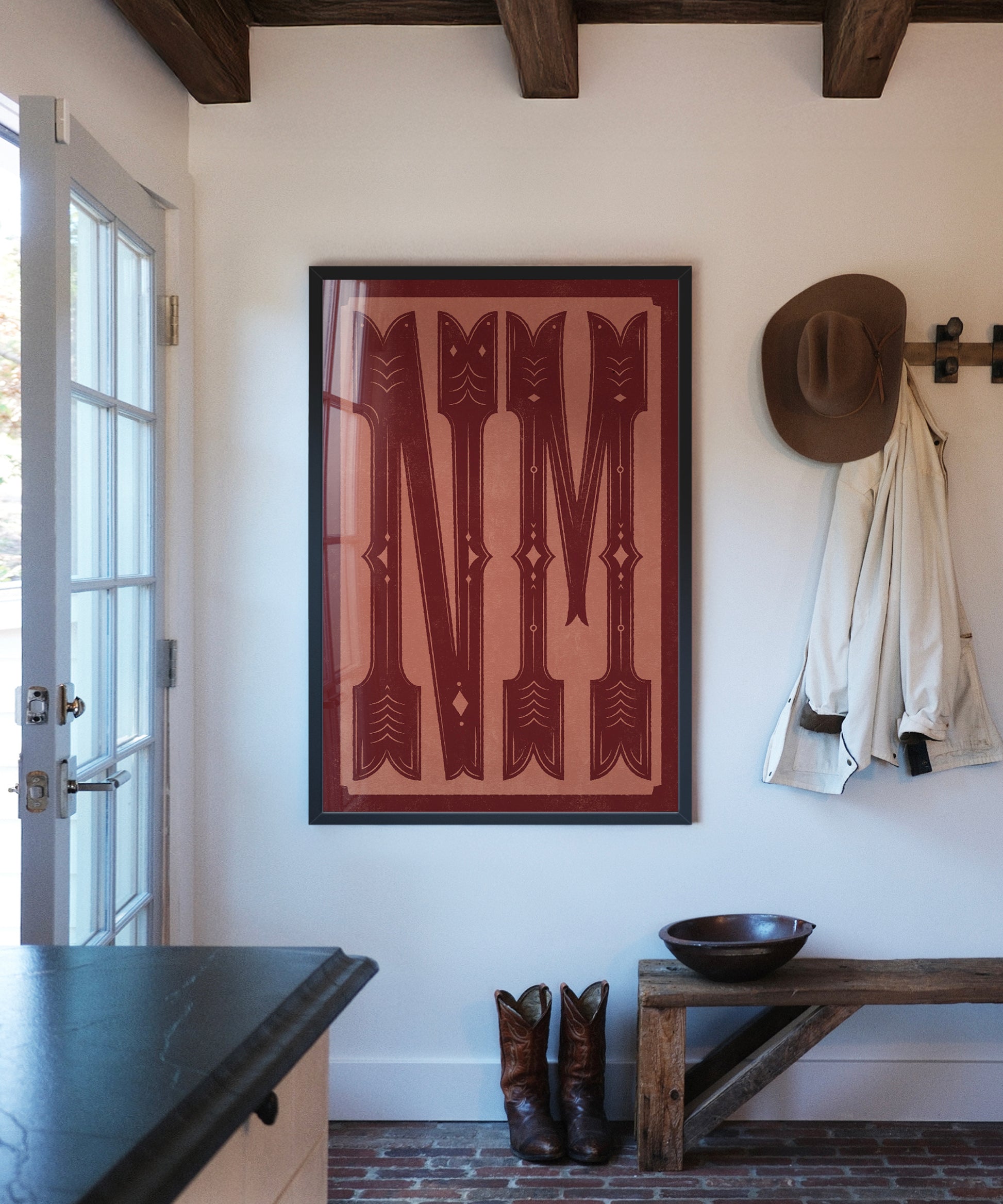 From adobe sunsets to endless desert skies, these bold letters celebrate the Land of Enchantment. Inspired by New Mexico’s rich colors and timeless southwestern spirit, this design captures the magic of the high desert in a big, bold way. Available in a western pattern, solid black, or deep clay red, these large letters are made to show off your New Mexico pride in style.