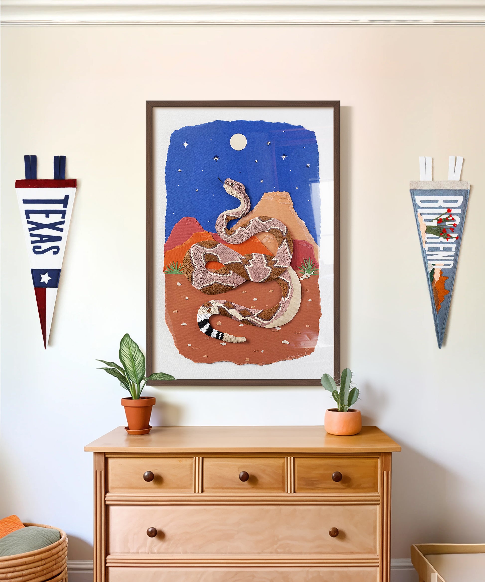 Slithering into the night is this amazing cut paper rattlesnake print by Andrea Cira. Made from an original piece that was created by layering hundreds of individually cut pieces of paper, the details in this piece are astounding. Once up close, you can see each and every scale was meticulously put into place, giving this print a 3D characteristic that makes the snake seemingly come to life.Â