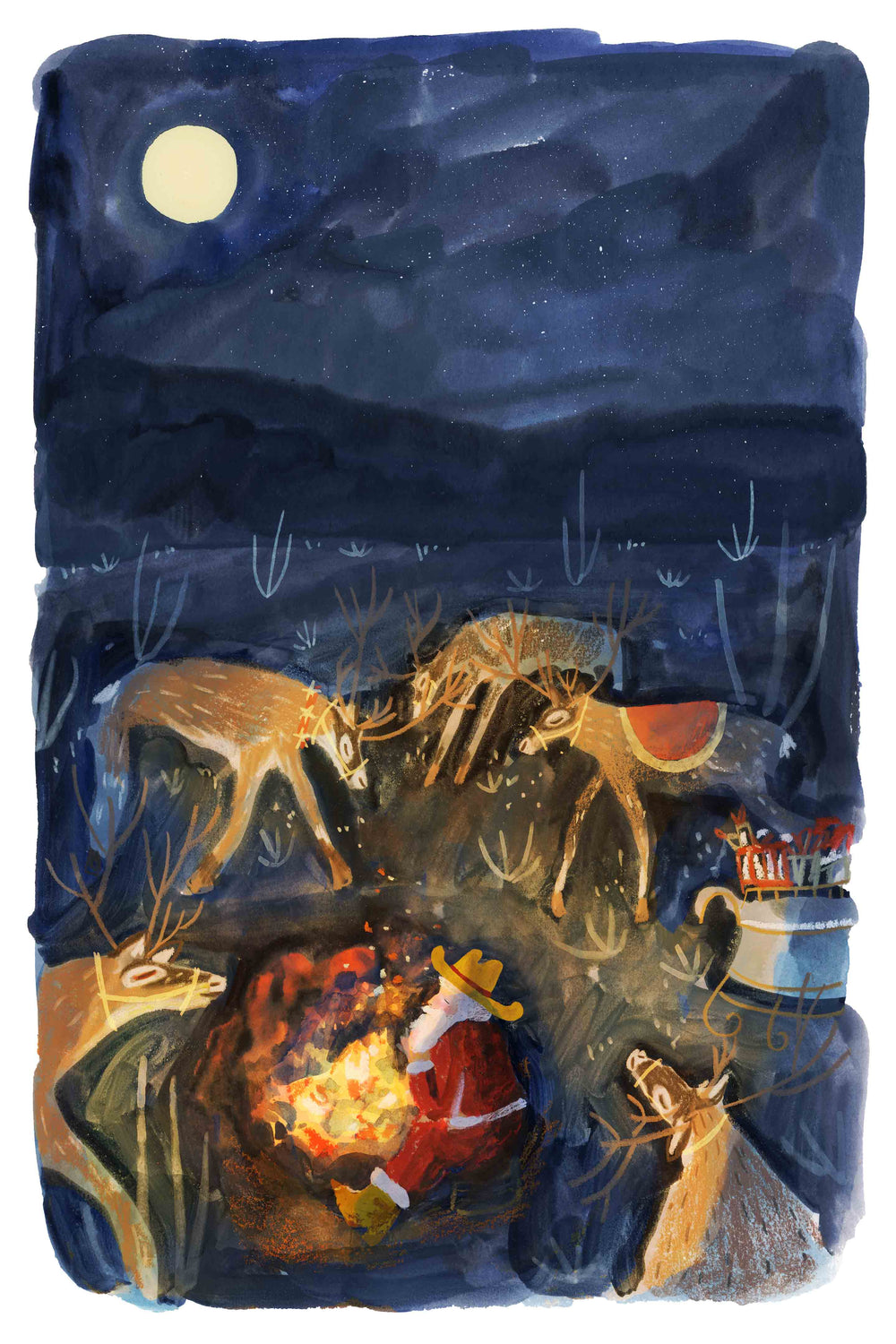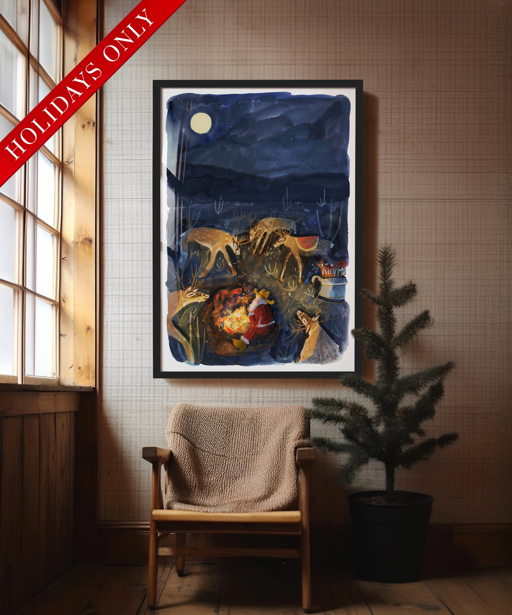 St. Nick makes his way around the world in one night, but even he has to stop and take a break every now and then. In this peaceful print by Melissa Lakey, Santa takes that break next to a glowing campfire in the desert, as he gives his reindeer some much-deserved rest. A piece that captures a rarely seen side of this yearly journey, "Santa's Pit Stop" is sure to add warmth and charm to your home this holiday season.