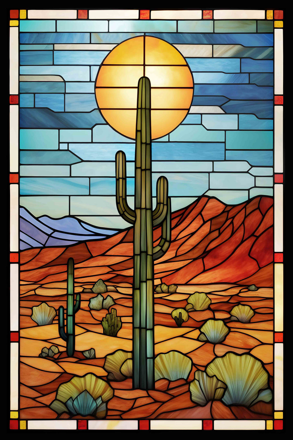 This Arizona desert landscape done in a colorful stained-glass style is print #2 in our Stained Glass Landscape Series. Look closely to see glass textures and glow within each piece as if light was truly shining through it!