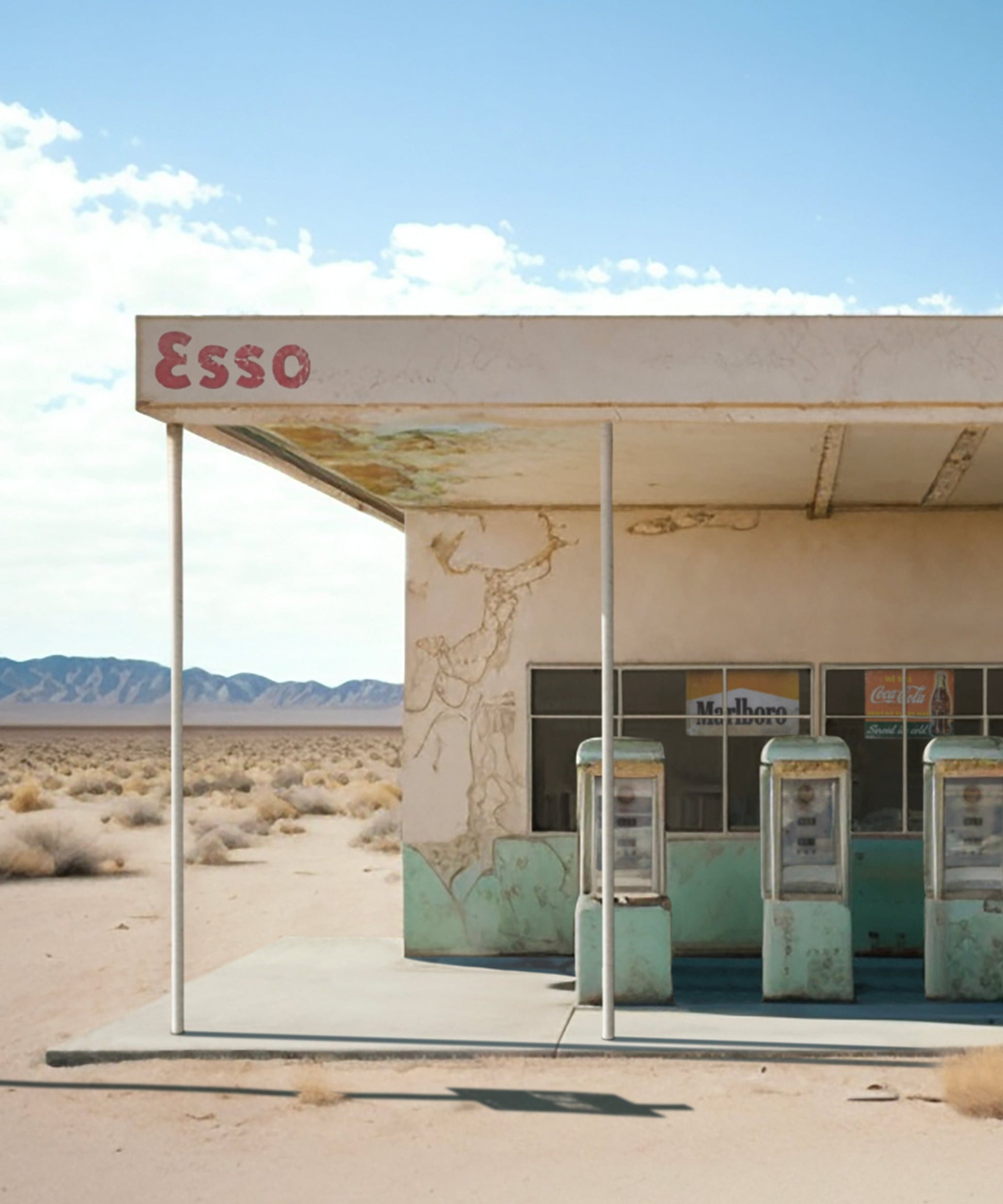 This print, entitled "The Esso," is print #4 of 7 in our Roadside Remains Series, a collection inspired by the long-forgotten places you'll pass on a road trip West. This abandoned Esso station once was the last stop before the long stretch of desert.