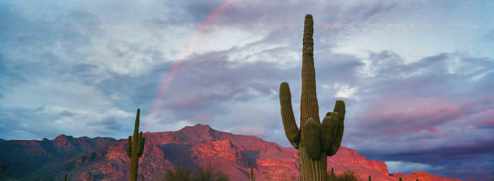 Bring a magical moment of the desert into your space with "Twin Saguaros," a captivating piece by photographer Cam Mackey. These towering sentinels of the Southwest stand proudly against a brilliant desert sky, and with a rainbow stretching from the glowing pink mountains, this shot truly evokes a sense of wander and serenity.