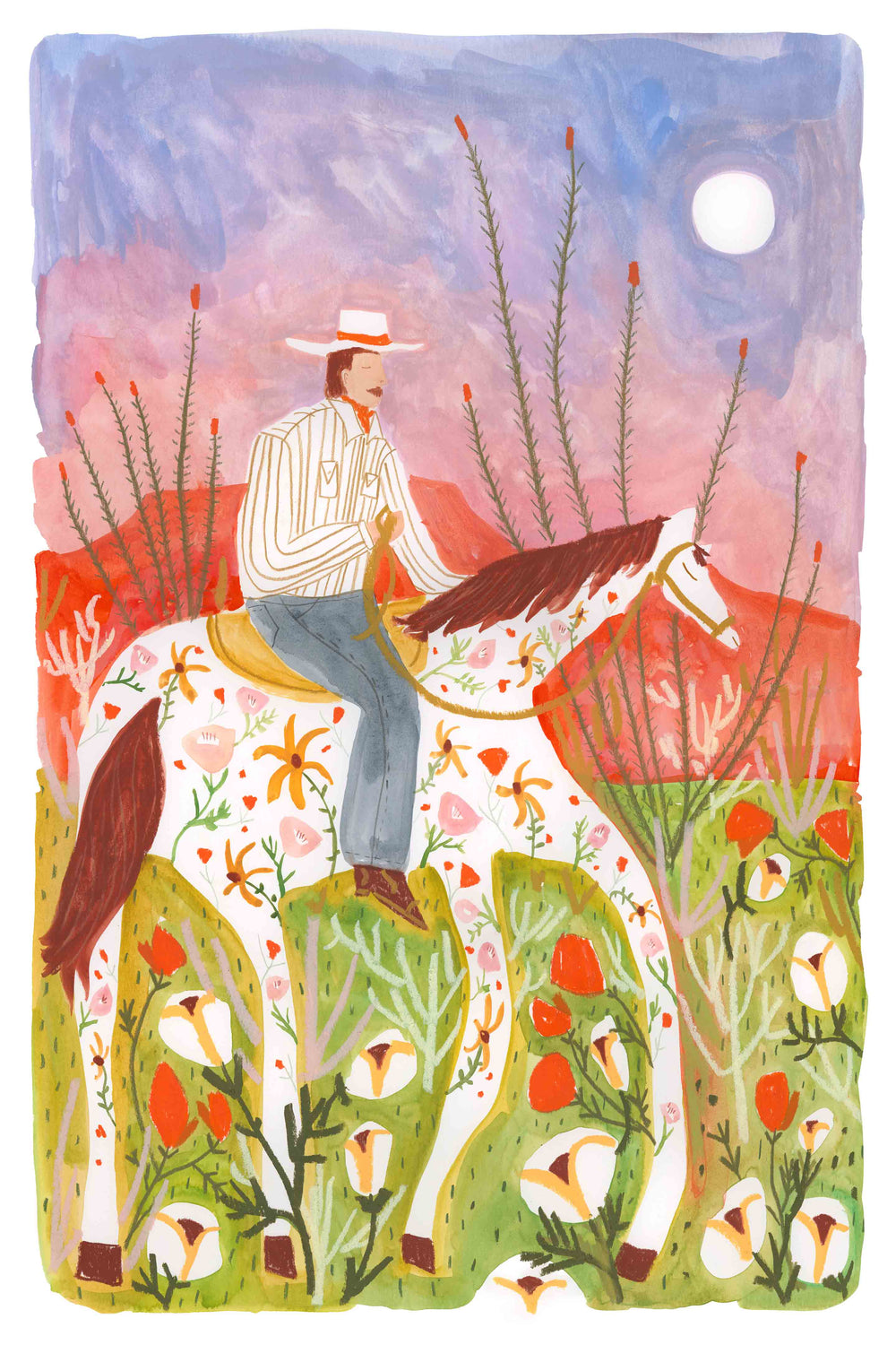 Melissa Lakey’s Wildflower Trail Ride captures a joyful cowboy journeying through a desert landscape on his flower adorned horse. Created in Lakey’s signature playful style, this piece radiates warmth and whimsy, making it an ideal addition to any western-inspired space. Whether adorning a nursery, living room, or hallway, its lively colors and cheerful composition are sure to brighten the atmosphere.